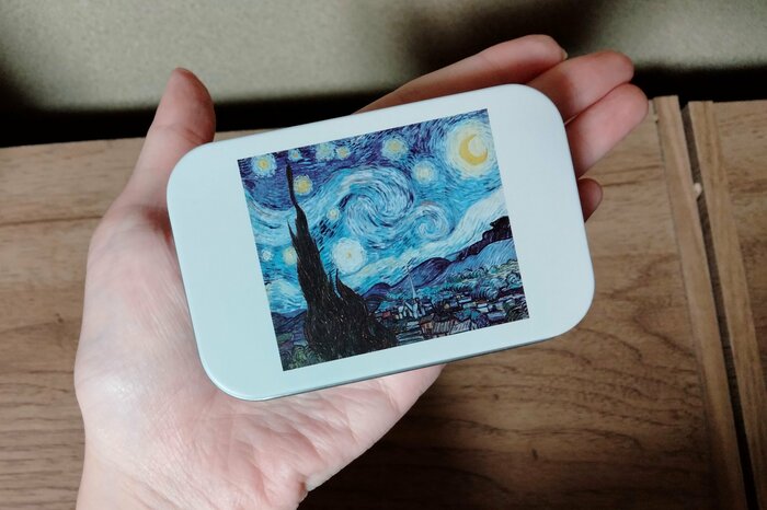 こちらがダイソーで販売されているスクエア缶です。写真のように、モネとゴッホの絵画が美しいです。オンラインストアは在庫切れも発生している人気アイテムとなっています。