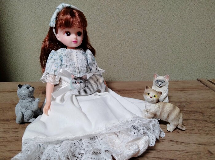 ダイソーの猫のミニチュアは、写真のようにリカちゃんにもぴったりなサイズ感です。大人のリカ活にも活用できそうです。