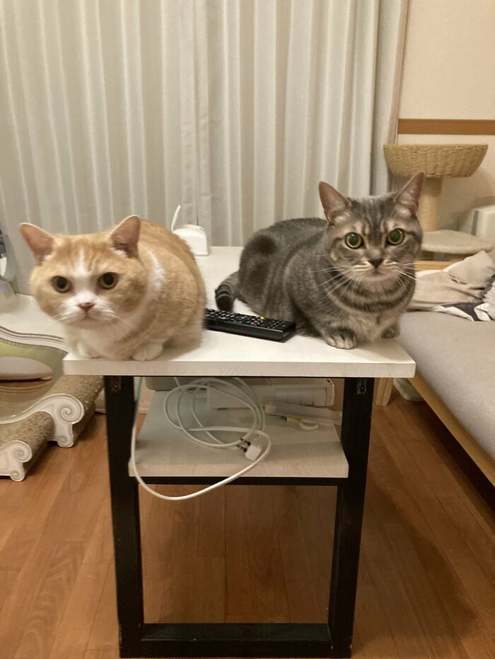 ふたりのキリリとした眼差しやシンクロする姿勢からは「そのちゅ~る、早くちょうだい!」なんてセリフが聞こえてきそう。どこか圧が伝わる光景に、思わず笑みがこぼれてしまいました。