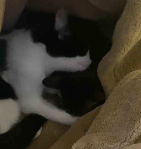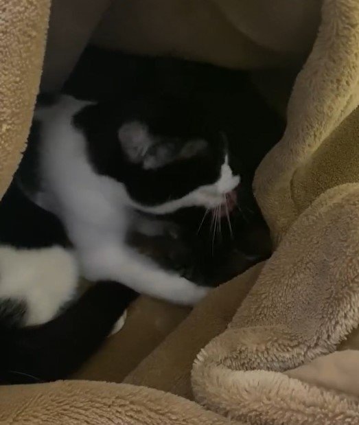 ハチワレ柄の猫ちゃんが、キジトラ柄の猫ちゃんを一生懸命に毛づくろいしていますね。布団が開いても気に留めないほど、一生懸命になっているようです……!