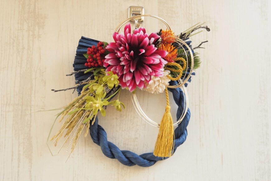 ピンクのダリアの造花と、青いしめ縄が目をひくインパクトがあるお正月リース。