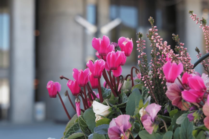 写真はピンクのカラーでまとめた例ですが、置き場所に合わせて白のガーデンシクラメンやニュアンスカラーのパンジーを使うのもオススメ。上手に管理すると、翌春まで長く楽しめます。