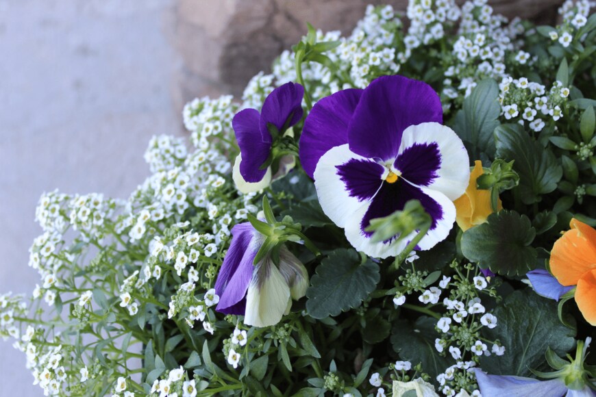 パンジー×白のスイートアリッサムは、パンジーの色次第で「カワイイ」も「スタイリッシュ」もつくれる最強コンビ。八重咲きパンジーをセレクトすると、雰囲気がグッと華やかになりますよ。
