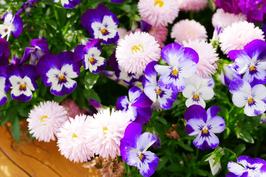 ビオラ×デージーも相性がよい組み合わせ。ふんわりとしたナチュラルな魅力で、玄関を爽やかに彩ってくれます。
