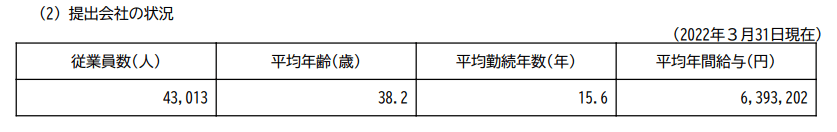 東日本旅客鉄道株式会社[JR東日本](提出会社)の2022年3月末時点での従業員数、平均年齢、平均勤続年数および平均年間給与は以下の通りです。