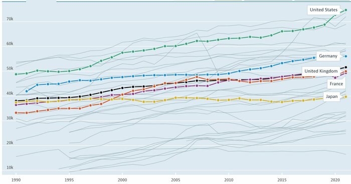 1990年時点では、日本は5カ国中第3位でした。しかし、2021年には、1990年当時日本より下だったフランスやイギリスに越され、大きな差をつけられています。