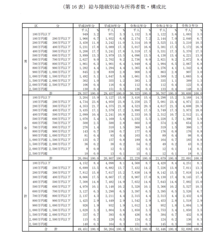 ではさらに詳しく、年収一覧表で「100万円以下~2500万円超」の金額ごとの割合を確認します。