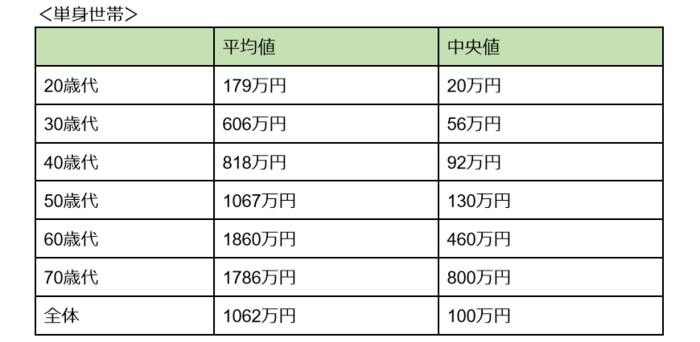 単身世帯の全体では、平均1062万円、中央値100万円となっています。20歳代は独身者が多いので、こちらの数値の方が参考になるでしょう。