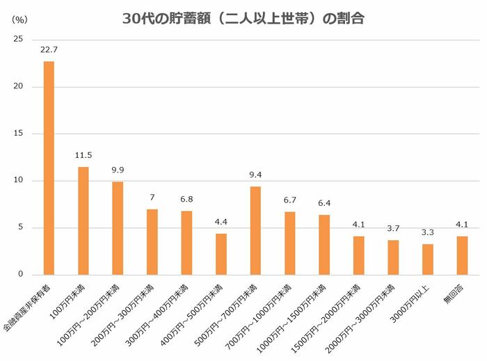 金額ごとのグラフをみると、金融資産非保有(貯蓄ゼロ)が22.7%と一番多くなっていますが、「100万円未満」11.5%、「100万円~200万円未満」9.9%に次いで、「500万円~700万円未満」が9.4%と割合が高くなっているのが興味深いところです。