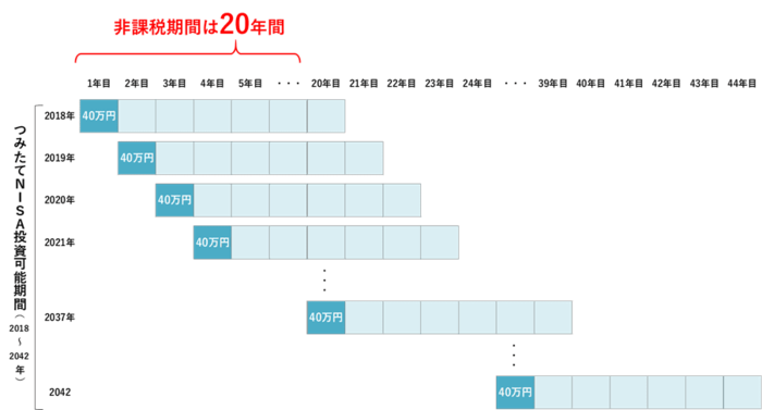 つみたてNISAの大きなメリットの1つは、毎年40万円を上限として非課税期間が最長20年間も設けられている点です。この20年間は分配金と譲渡益に対して税金が課されません。
