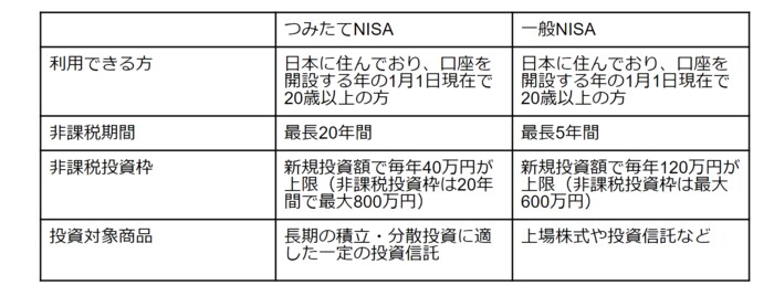 最後に、現行のつみたてNISAと一般NISAの違いを比較して紹介します。