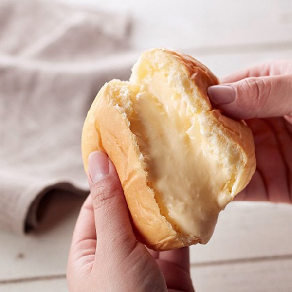 くりーむパンカスタードは、あっさりシンプルなカスタードクリームに生クリームを合わせたプレーンな「くりーむパン」です。クリームはとろっとしたなめらかな舌ざわりが特徴。そのほか、くりーむパン生クリーム&カスタード・くりーむパン抹茶・くりーむパン小倉・くりーむパンチョコレートが楽しめます。