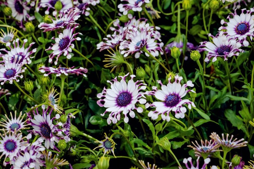 キク科のオステオスペルマムは冬から春にかけて花が咲く多年草。マーガレットに似た可愛らしい花を咲かせます。