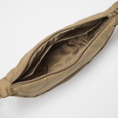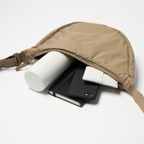 ユニクロのハーフムーンバッグは、ポリエステル素材なので、体にフィットしやすいです。収納力もあるので、スマホや長財布だけでなく、ノートなども入れることができます。