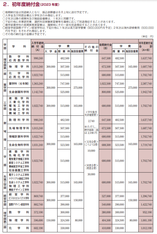 東京理科大学・薬学部薬学科の納付金は以下のような構成となっています。
