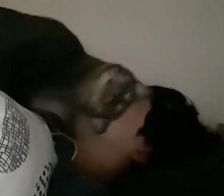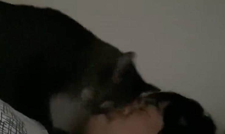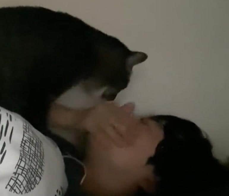 動画の冒頭から、シイタケくんは熱いスリスリを繰り広げていました。飼い主さんの顔の左右両側をぬかりなくスリスリ。「早く起きてよ~」といわんばかりに、何度も繰り返しています。