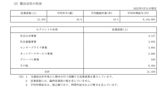 日本電気(提出会社)の2022年3月末時点での従業員数、平均年齢、平均勤続年数および平均年間給与は以下の通りです。