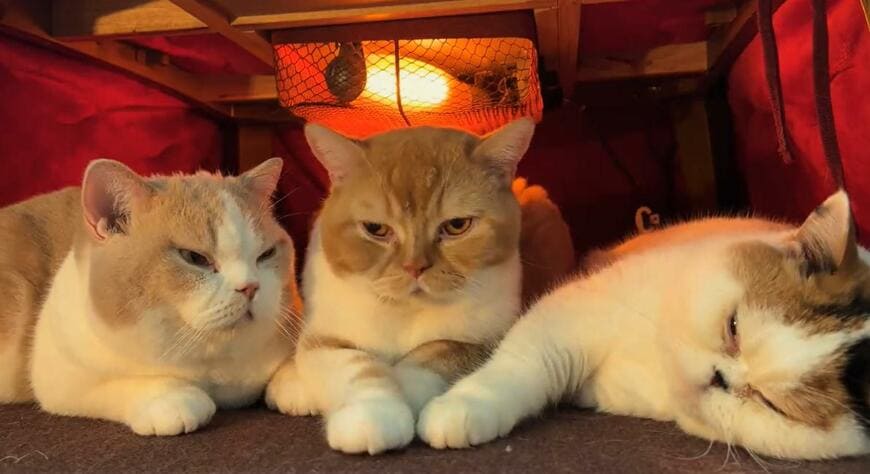 投稿主さんはリプライ欄で「混み合っているサウナのよう」といったコメントをされていました。さらに「私も間に入りたいです!」「仲間に入れてほしい……!」「気持ちよく3匹でコタツに並んでいる!」といった、猫ちゃん達に悶絶する人たちの声も数多く寄せられていました。