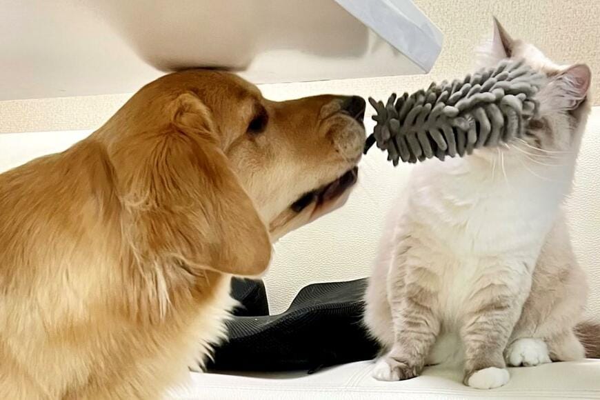 ハンディモップを拾って猫のお顔をキレイキレイする犬(これで一緒に遊ぼうと誘っている) pic.twitter.com/RPDgzhkaWQ
