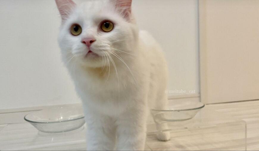 フードのお皿らしき物も写っていますが、1枚目の写真と同じくやや前のめり気味におねだり!加えて「キリッとした真剣な眼差し」も変わらないようです。成長後のマオくんの視線にもグッと引き込まれてしまいますね……!
