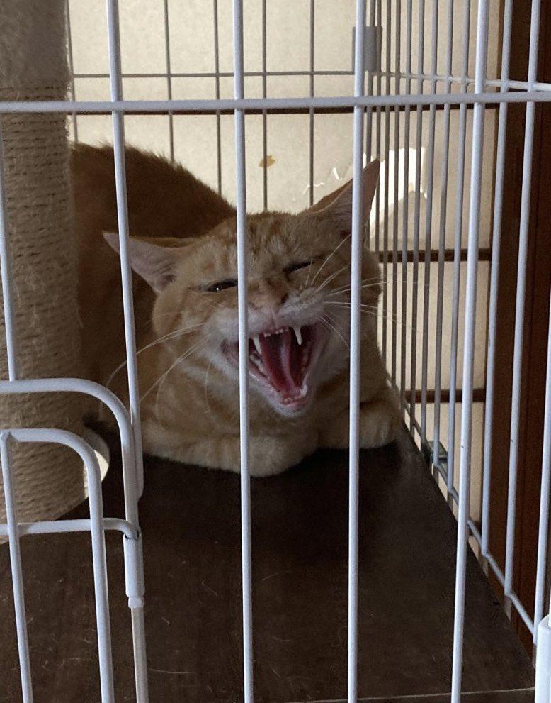 口を大きく開いて目を細め、こちらを威嚇している様子のリチャードくん。保護直後の表情からは、不安げな気持ちや警戒心が漂います。