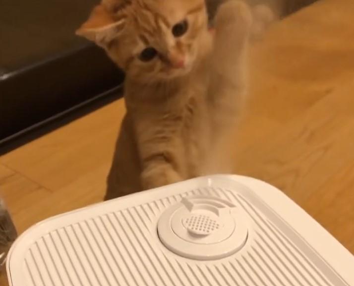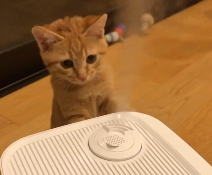 加湿器に興味津々!蒸気にチョイチョイする保護猫さんがかわいい