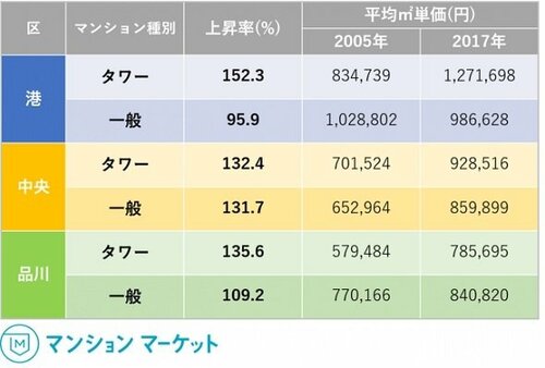 2005年の築年当時と2017年現在の価格を比較したところ、港区の一般マンション以外はすべて価格上昇する結果に。港区は、一般マンションの価格ではマイナスとなったものの、タワーマンションにおいては3区の中で最も価格上昇率が高くなりました。
