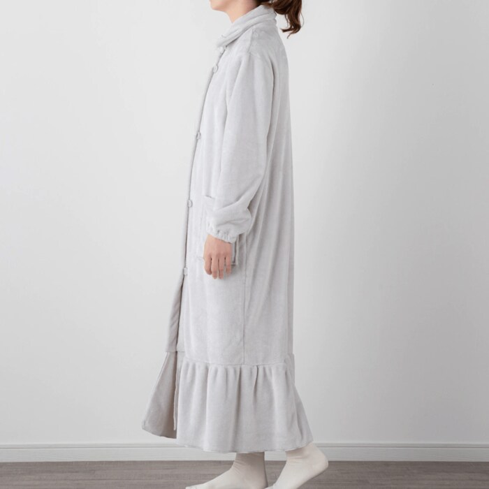 足元がフリルになったデザインがかわいいこちらは、デコホームのみで取り扱われている限定商品。襟を立てると首元まで暖かくなります。カラーラインナップは3色でどれも着用しやすいくすみカラーが特徴。袖口はゴムが入っており、腕まくりしやすいのもポイントです。