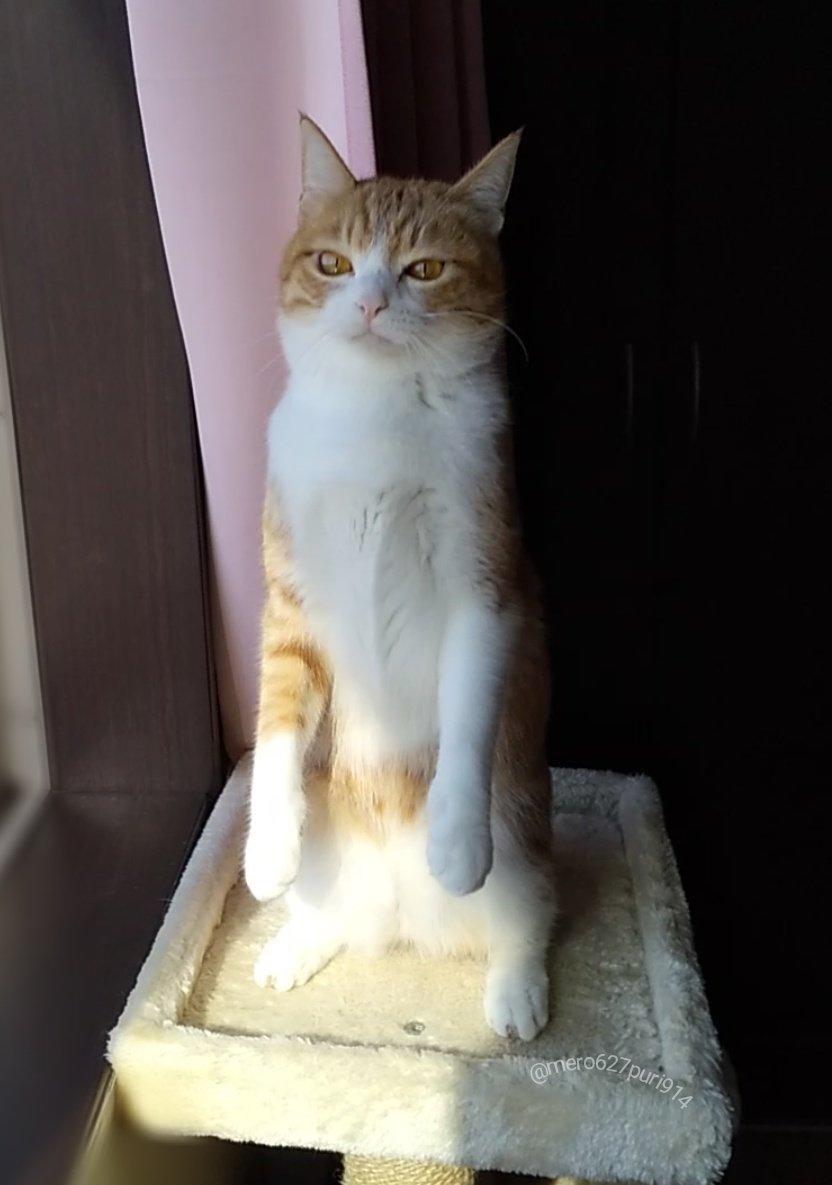 写真に写っているのは、推定1歳の女の子「プリン」ちゃん。二本足でヒョッコリと直立し、愛らしいモフモフのお腹を見せています!
