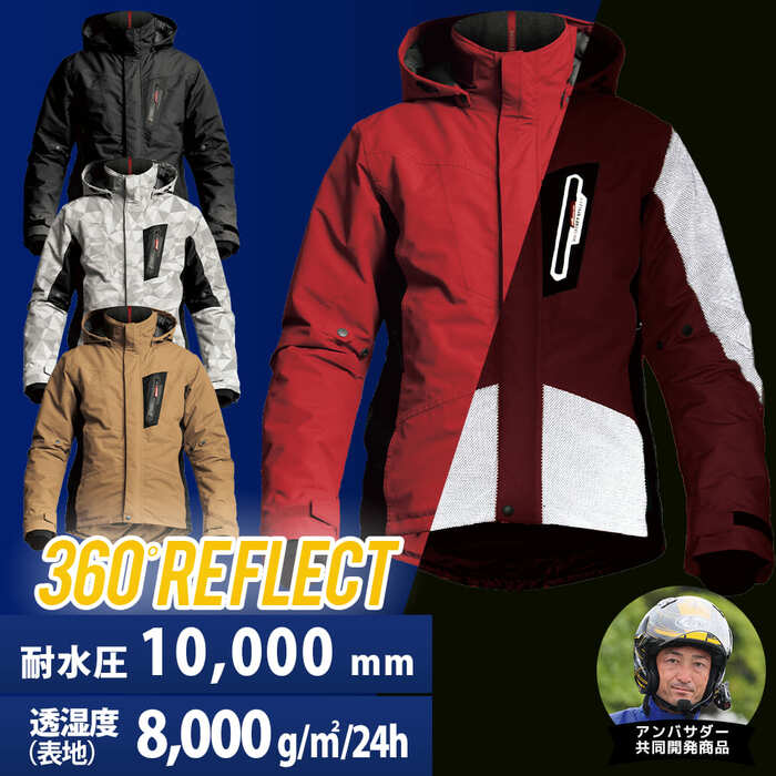 アウトドアやバイクジャケットとしても重宝する「イージス360°リフレクト透湿防水防寒ジャケット」。2022年モデルはWフラップ・Wファスナーを採用し、雨や風をより一層防げるようになっています。別売りのインナーベストを取り付ければ、さらに保温性がアップするため寒さに合わせたカスタマイズも可能です。