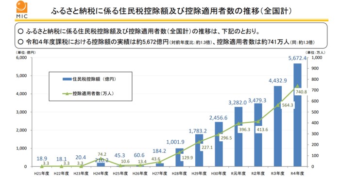 総務省の「ふるさと納税に関する現況調査結果」によると、令和3年度の控除適用者数はおよそ741万人と発表されています。