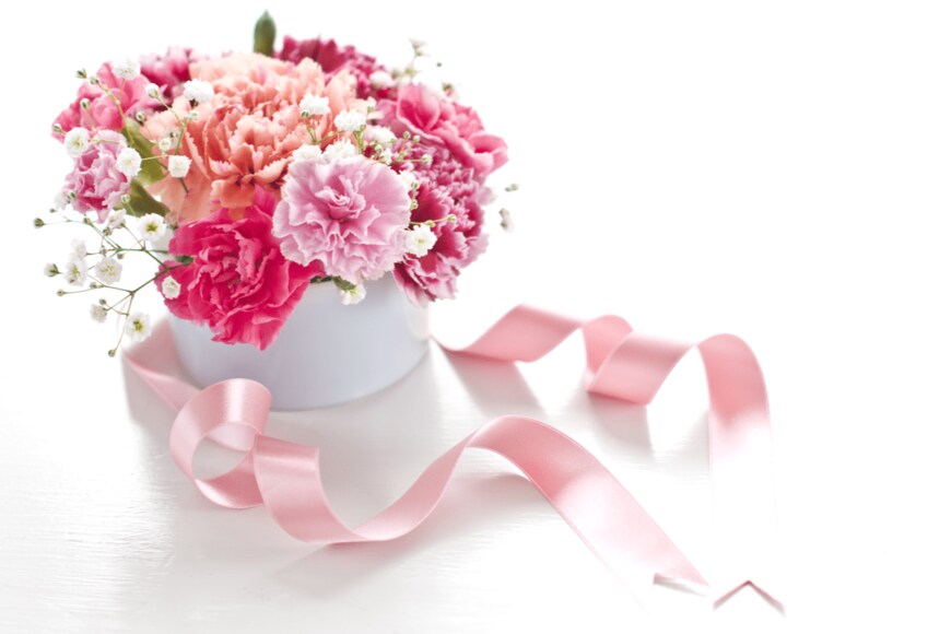 複数色のカーネーションとカスミソウを組み合わせたかわいいアレンジメントです。