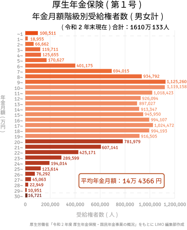 厚生労働省年金局「厚生年金保険・国民年金事業の概況」2021年度によると、老齢厚生年金の平均月額(老齢基礎年金を含む)は14万4366円です。