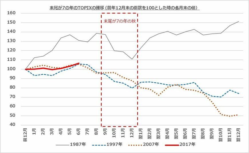 ところで、今年は2017年。実は「末尾が7の年は市場が荒れる」と言われています。理論や理屈でうまく説明できる因果関係があるわけでもなく、ジンクスのような話なのですが、過去30年を振り返ると、事実としては確かに1987年、1997年、2007年には経済史に残るような大きな暴落が発生しました。