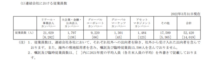 みずほフィナンシャルグループの給料はいくらか 。平均年齢・勤続年数も【2022年更新版】 就職と転職の企業調査・分析シリーズ 2023.01.12 03:50 公開 執筆者LIMO編集部 copy URL 目次[開く] 1. みずほフィナンシャルグループの平均年間給与はいくらか 2. みずほフィナンシャルグループの従業員数は何人か 3. まとめにかえて 参考資料 2. みずほフィナンシャルグループの従業員数は何人か また、連結会社における従業員数は以下の通りです。 出所:出所:みずほフィナンシャルグループ「有価証券報告書」 リテール・事業法人カンパニー: 2万1029人 大企業・金融・公共法人カンパニー:1797人 グローバルコーポレートカンパニー :9220人 グローバルマーケッツカンパニー :1301人 アセットマネジメントカンパニー :1484人 その他:1万7589人 合計: 5万2420人 3. まとめにかえて < 1 2 3 4 > 関連タグ #就職 #みずほフィナンシャルグループ #給与 #年収 注目コンテンツ 退院後の通院治療に3000円。通院保障がつけられる医療保険はこれ![PR] 【LIMOで懸賞】新しいプレゼントが続々登場中!最新情報はこちらから[PR] 糖尿病や高血圧など生活習慣病に備えるなら。まとまった一時金が受け取れる保険。[PR]