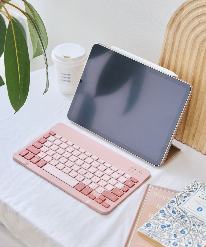パステルカラーがかわいい薄型ワイヤレスキーボードです。さきほどご紹介した折りたたみテーブルとの相性も良さそうです。