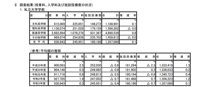 文部科学省が公表する「私立大学等の令和3年度入学者に係る学生納付金等調査結果について」によると、私立大学の進学費用の平均額は以下の通り。