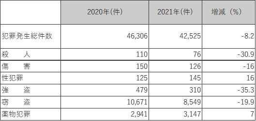 治安については、2021年の犯罪発生総件数が前年比で8.2%減少しており、比較的安定しているといえます。
