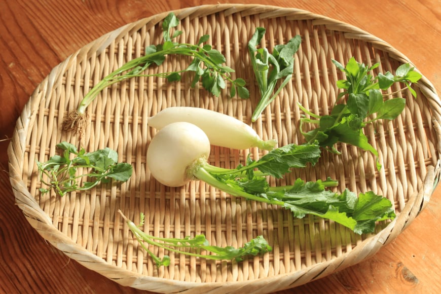 昔は早春、雪の中に生えている野草を採る「若菜摘み」と呼ばれる風習があり、生命力のある野草を食べることで無病息災を願っていました。その風習が現在の7種類の野菜・野草に繋がっています。