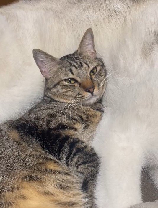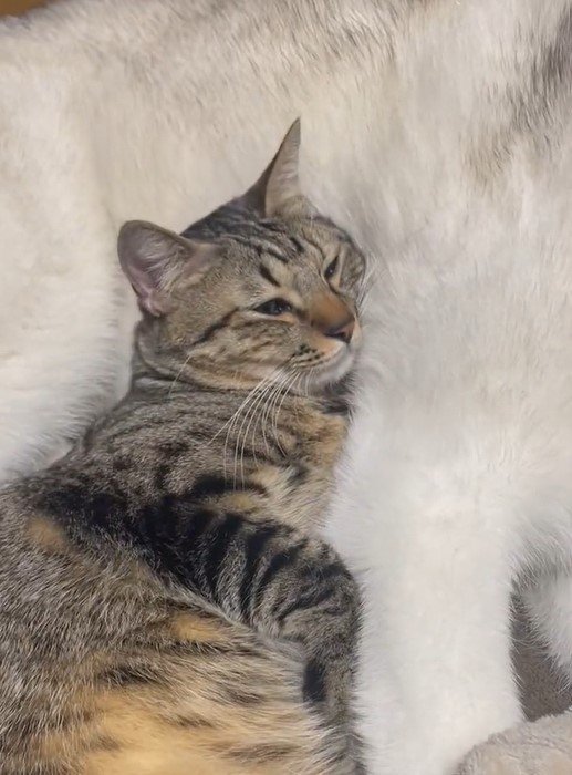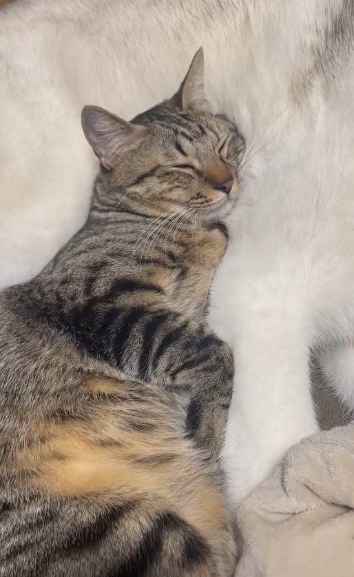 サンくんが寝ていたのは、ユキちゃんの前足と後ろ足の間でした。お腹を枕にするかのような格好で、ウトウト……!安心感と深い幸せが伝わってくる、なんとも微笑ましい光景です。