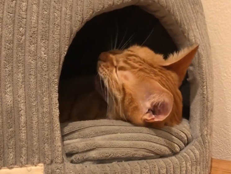 大きなあくびをして、そのままスヤスヤ。そんなきいちゃんの姿に警戒心は感じられず、深い安心感に包まれていることが読み取れます。