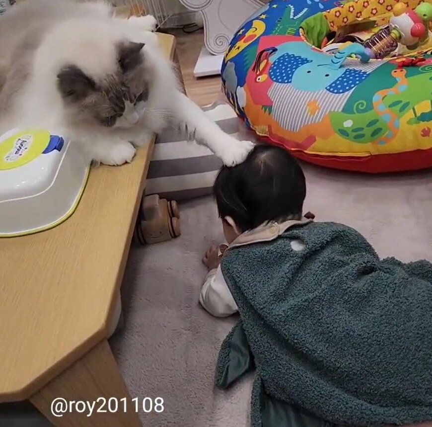 そしてロイくんは、伸ばしたおててで赤ちゃんの頭に「ピタッ」と触れます。その光景はまるで「ゴッチンしないように……」と、優しく動きを制止して守ってくれているかのよう。