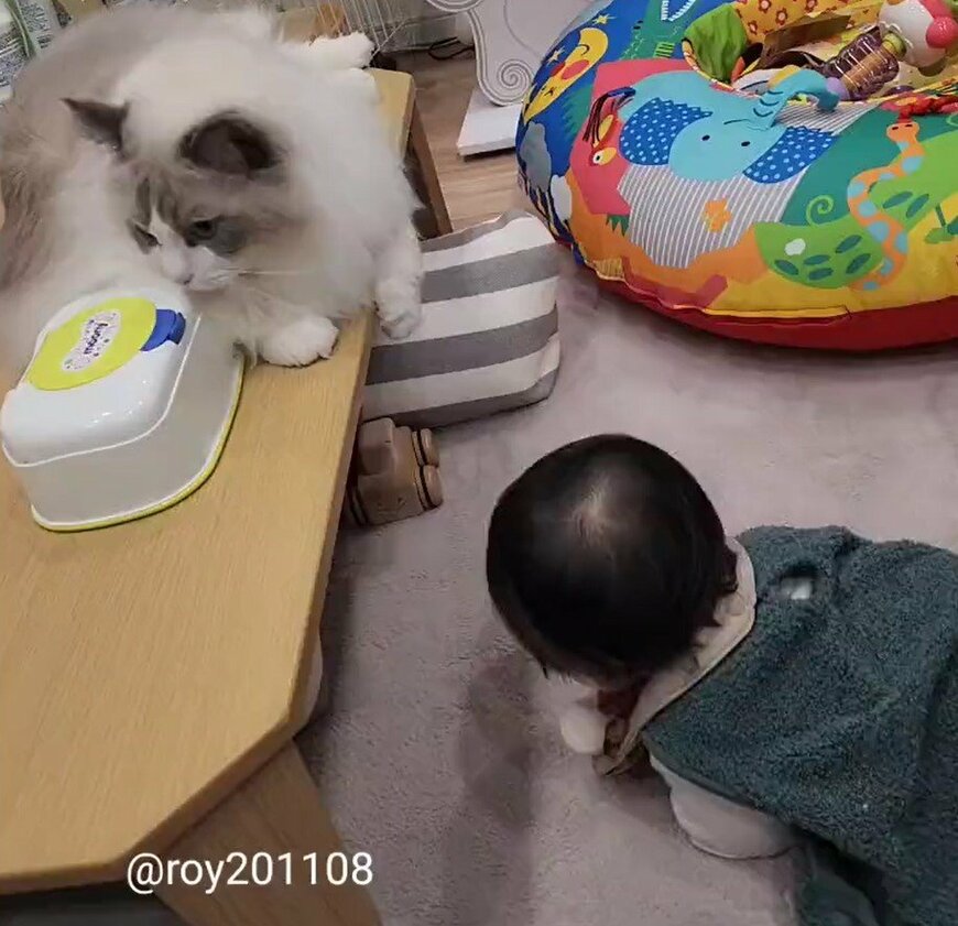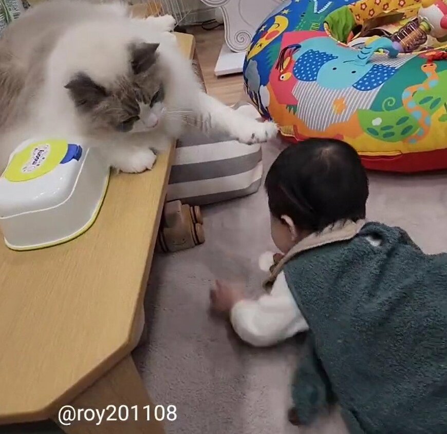 「これ以上は危にゃい」猫ちゃんと赤ちゃんの微笑ましい光景が話題に