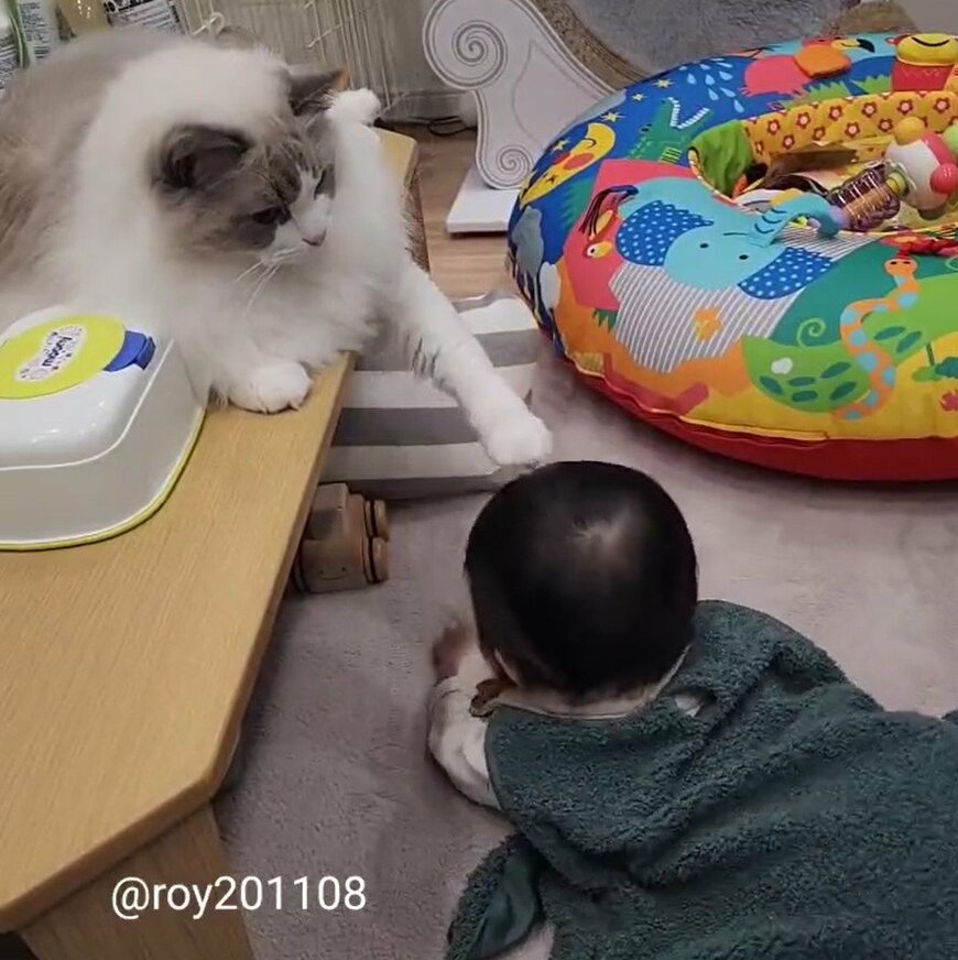 そんなロイくんと赤ちゃんの微笑ましいワンシーンからは「赤ちゃんを守ろうと思ったのか、それとも一緒に遊びたかったのか、はたまたこの時は距離を保ちたかったのかな……?」など、さまざまな想像が膨らんできますね。