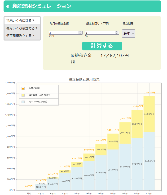 30年間、毎月3万円を預貯金だけで積立てた場合は1080万円、年率3%で運用できた場合は1748万2107円。かなりの差がつきますね。