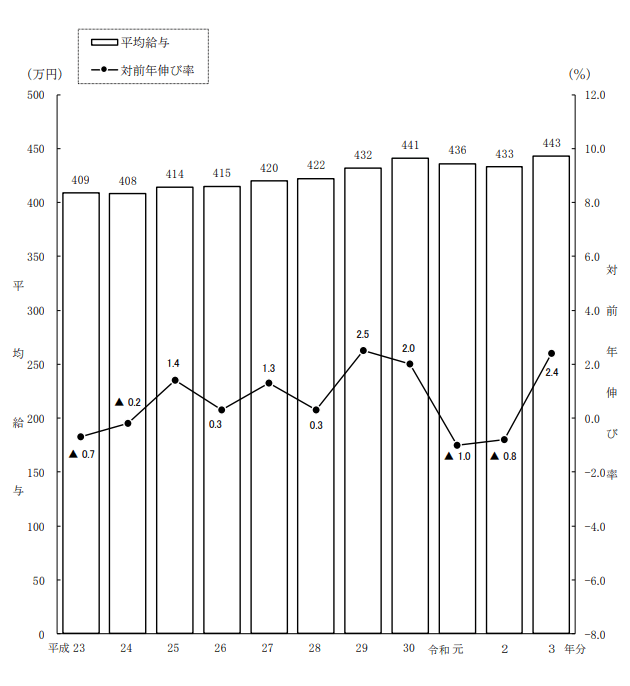 国税庁の「令和3年分 民間給与実態統計調査」によると、日本人の1年間を通した給与平均は443万円となっています。