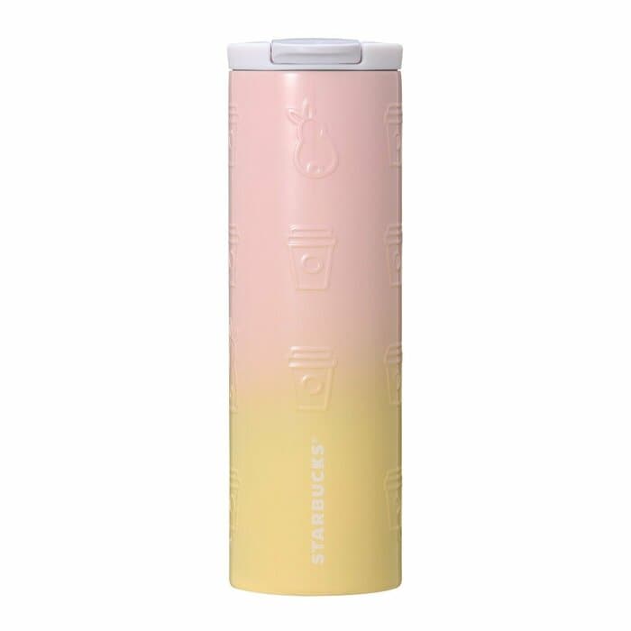 ペーパーカップとラビットをエンボスでデザインしたステンレスタンブラーです。ピンクとイエローのグラデーションが印象的。一見シンプルですが、ペーパーカップのイラストがエンボス加工され、キュートなラビットの後ろ姿がまぎれている遊び心のあるデザインとなっています。