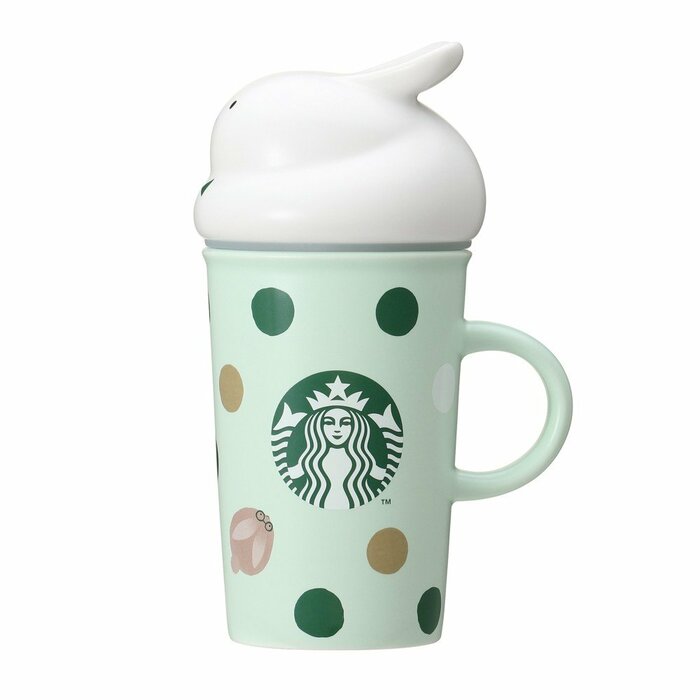 ラビット型のリッドが付いたユニークなマグカップです。付属のリッドを付けると、ホイップラビットがマグに入って休んでいるように見える、愛らしいデザインが特徴です。ボディのドットの中にもラテラビットがまぎれているので、ぜひ見つけくださいね。