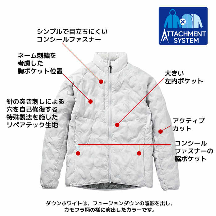 - カラー:ブラック、チャコール、ダウンホワイト(ダウンホワイトは、フュージョンダウンの陰影を出し、カモフラ柄の様に演出したカラーです)