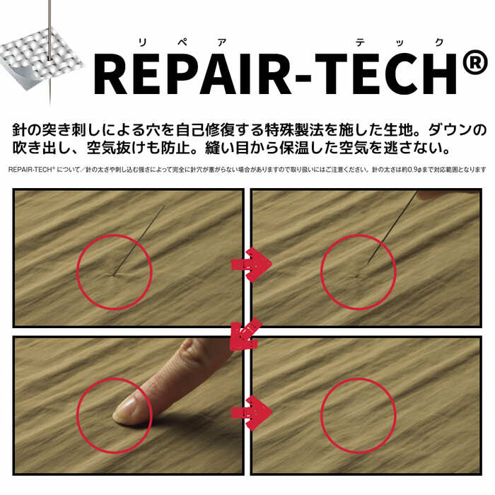 リサイクルダウンと吸湿発熱わたをブレンドしたフュージョンダウンを使用したり、針の突き刺しによる穴を自己修復する特殊製法を施したリペアテック生地を採用し、さらには撥水・汚れが取れやすい加工のDIAMAGIC DIRECT(ディアマジックダイレクト)仕様するなどこだわりがたっぷり詰まっています。ポケット袋布は、地球環境に配慮した生地DIARETEX(ディアリテックス)を使用するなど、細部まで考えられているのがうれしいですね。